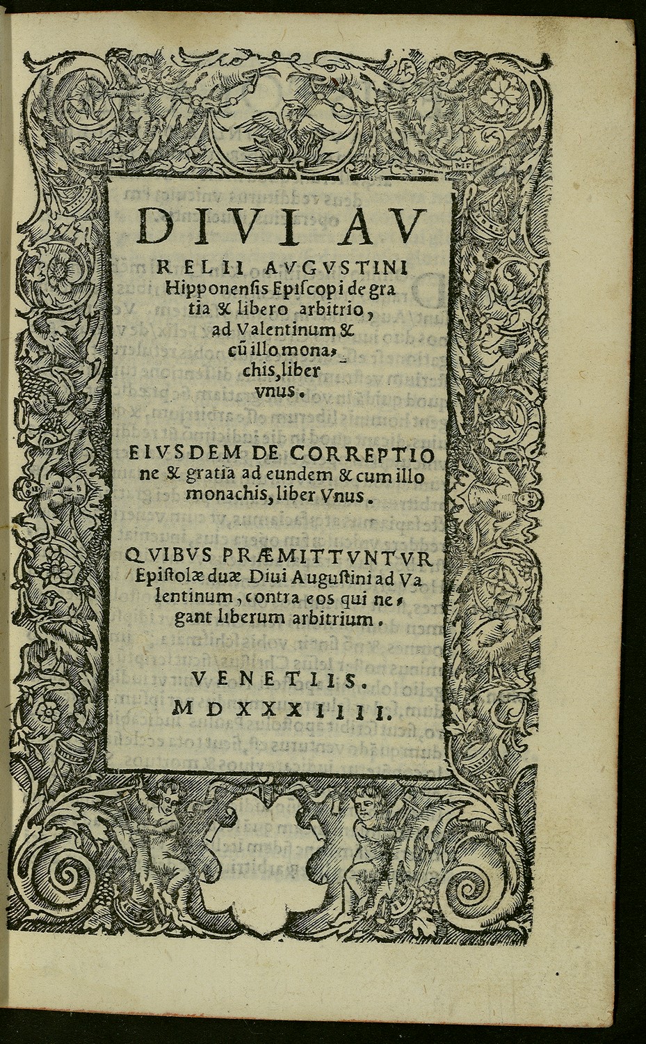 Diui Aurelij Augustini Hipponensis episcopi De gratia & libero arbitrio, ad Valentinum & cum illo monachis, liber vnus. Eiusdem de correptione & gratia … liber vnus. Quibus praemittuntur epistolae duae diui Augustini ad Valentinum contra eos qui negant liberum arbitrium. – Venetijs : [Giovanni Padovano & Venturino Ruffinelli], 1534 (Venetijs : per Ioannem Patauinum, & Venturinum de Ruffinellis, 1534). – [48] c. ; 8. ((Marche nella cornice sul front. (U156) e in fine (V422). – Romano – Segn.: A-F8. – Frontespizio in cornice xilografata))