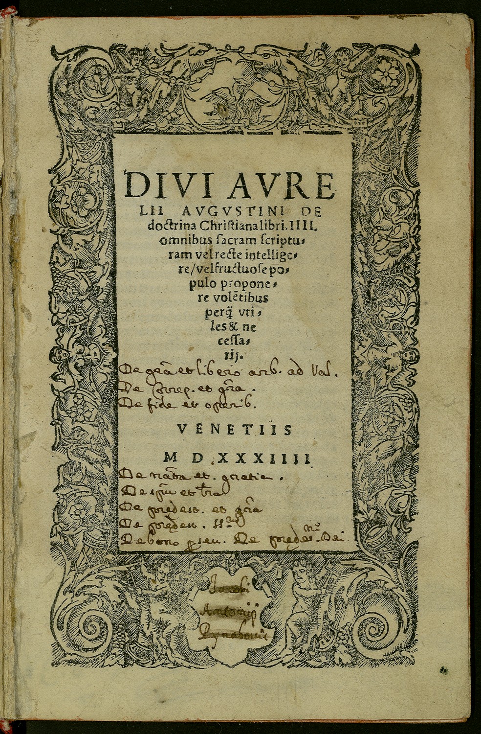 Diui Aurelij Augustini De doctrina christiana libri 4. omnibus sacram scripturam vel recte intelligere, vel fructuose populo proponere volentibus perquam vtiles & necessarij– Venetijs : [Giovanni Padovano & Venturino Ruffinelli], 1534 ((Venetijs : per Ioannem patauinum, & Venturinum de ruffinellis, 1534) – [76] c. ; 8º ((Nel titolo il numero 4 e espresso: IIII. – Marche nella cornice sul front. (U156) e in fine (V422). – Gr. ; rom. – Segn.: A-I8 K4. – Front. in cornice xilogr.))