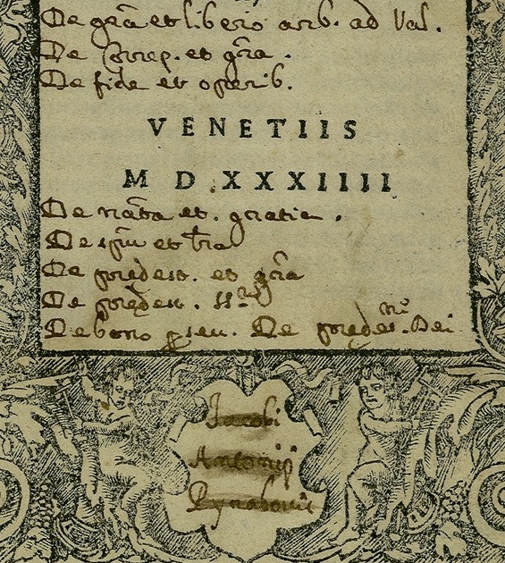Legatura recente in tela e cartone. Sul dorso tassello in pelle con autore e titolo”Operette”. Frontespizio in cornice figurata: Fenice sulle fiamme volta verso il sole. (V422). Marca in fine: Fenice su fiamme. Motto: Nunquam deficiam: cremer usque licet. Le iniziali xilografiche predisposte sono assenti. Nel frontespizio annotazioni manoscritte su opere di Agostino. Nel cartiglio della cornice nome del possessore: Jacobi Antonio Pyrabonie? e alla c. 3. Nel volume sono legati insieme tre testi di opere di S. Agostino stampate dagli editori Padovano e Ruffinelli sempre nel 1534, ma sappiamo che nello stesso anno stamparono altre parti di opere del santo, De fide et operibus, De natura et gratia, De spiritu et litera, che in altri esemplari si trovano legate insieme.