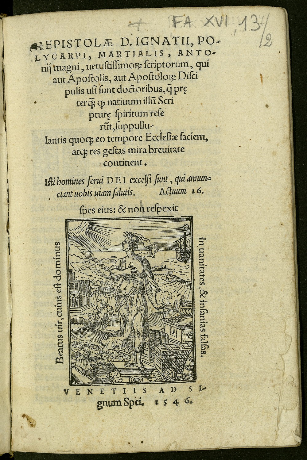 Epistolae d. Ignatii, Polycarpi, Martialis, Antonij Magni, uetustissimorum scriptorum, qui aut Apostolis, aut Apostolorum discipulis usi sunt doctoribus, que pręterquam quod natiuum illum scripturę spiritum referunt, suppullulantis quoque eo tempore Ecclesiæ faciem, atque res gestas mira breuitate continent – Venetiis : ad Signum Spei, 1546 – 80 c. ; 8º (Riferimenti: CNCE 32980. – Marca (Z1127) sul frontespizio – Segn.: 2A-2K⁸. )