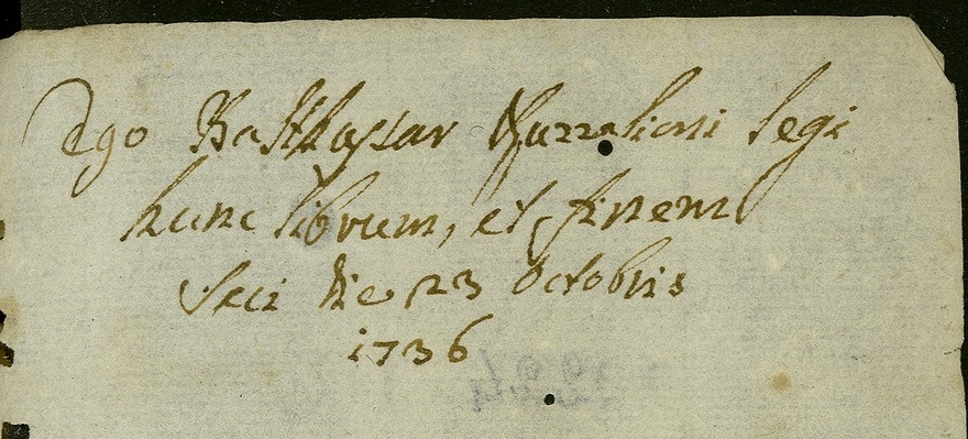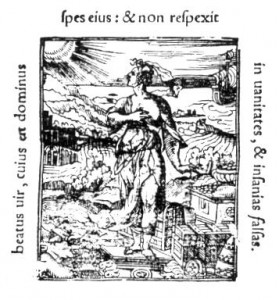 Coperta non coeva. Lieve macchia di umidità sul fondo delle pagine. Presenza di fori di tarli nelle pagine finali. Nella penultima carta bianca annotazione di un possessore datata 1726. Annotazioni manoscritte a margine, sottolineature e diverse mani scritte. Marca editoriale: Speranza rappresentata da una donna rivolta verso il sole. Motto (in corsivo): Beatus vir, cuius est Dominus spes eius: & non respexit in vanitates, & insanias falsas sul frontespizio.