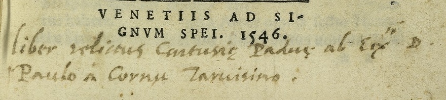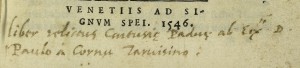 Coperta non coeva e presenza di fori di tarli nelle prime pagine. Testo in corsivo romano con iniziali xilografiche decorate. Marca editoriale: Speranza rappresentata da una donna rivolta verso il sole. Motto (in corsivo): Beatus vir, cuius est Dominus spes eius: & non respexit in vanitates, & insanias falsas. (Z1127) [motto]: Beatus vir, cuius est Dominus spes eius: & non respexit in vanitates, & insanias sul frontespizio. Dal frontespizio sappiamo che il libro era di un monaco della Certosa di Padula.