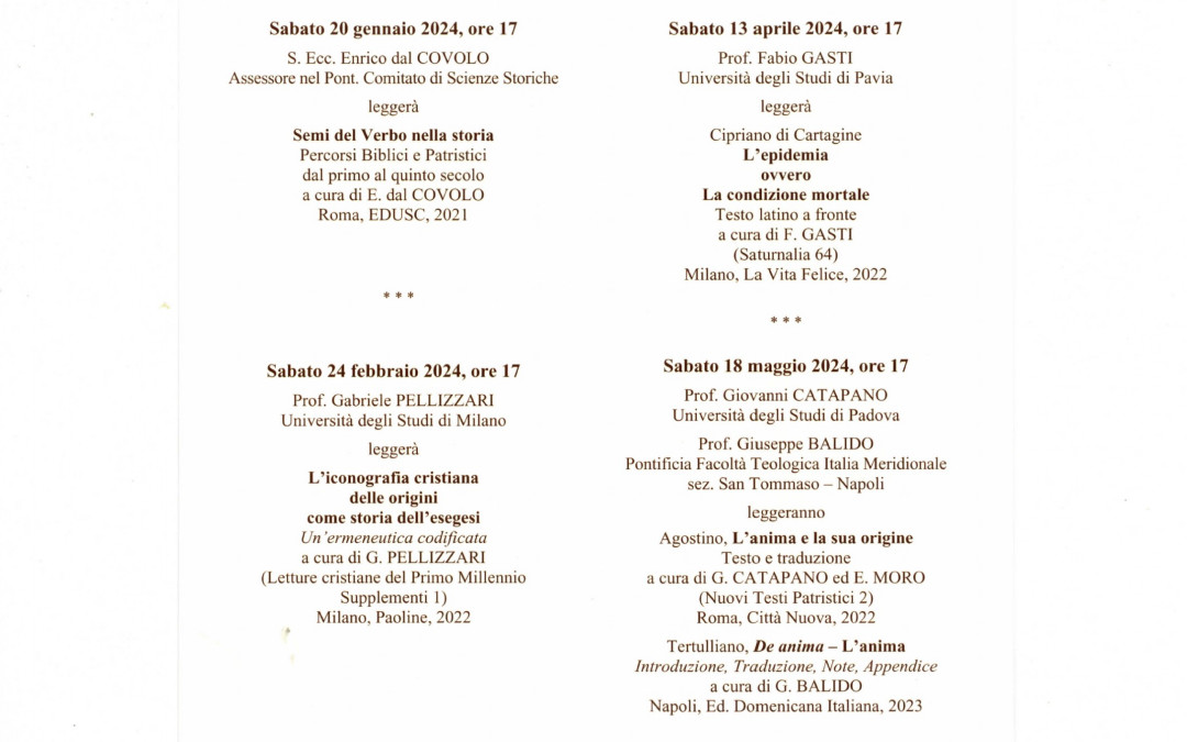 L’Istituto delle Piccole Ancelle di Cristo Re, nel solco tracciato dal cofondatore padre Giacinto Ruggiero ofm, promuove e diffonde lo studio e la conoscenza dei Padri della Chiesa. La voce dei Padri è la voce di una tradizione viva, che ha guidato e animato il cammino della civiltà romano-germanica e di quella europea. LECTURA PATRUM N EAPOLITANA a cura di Teresa PISCITELLI e Suor Leonia BUONO ANNO XLII – 2024 Aula Magna – Casa del Volto Santo Via Ponti Rossi, 54 (Capodimonte) NAPOLI Sabato 20 gennaio 2024, ore 17 S. Ecc. Enrico dal COVOLO Assessore nel Pont. Comitato di Scienze Storiche leggerà Semi del Verbo nella storia Percorsi Biblici e Patristici dal primo al quinto secolo a cura di E. dal COVOLO Roma, EDUSC, 2021 Sabato 24 febbraio 2024, ore 17 Prof. Gabriele PELLIZZARI Università degli Studi di Milano leggerà L’iconografia cristiana delle origini come storia dell’esegesi Un’ermeneutica codificata a cura di G. PELLIZZARI (Letture cristiane del Primo Millennio Supplementi 1) Milano, Paoline, 2022 Sabato 13 aprile 2024, ore 17 Prof. Fabio GASTI Università degli Studi di Pavia leggerà Cipriano di Cartagine L’epidemia ovvero La condizione mortale Testo latino a fronte a cura di F. GASTI (Saturnalia 64) Milano, La Vita Felice, 2022 Sabato 18 maggio 2024, ore 17 Prof. Giovanni CATAPANO Università degli Studi di Padova Prof. Giuseppe BALIDO Pontificia Facoltà Teologica Italia Meridionale sez. San Tommaso — Napoli leggeranno Agostino, L’anima e la sua origine Testo e traduzione a cura di G. CATAPANO ed E. MORO (Nuovi Testi Patristici 2) Roma, Città Nuova, 2022 Tertulliano, De anima — L’anima Introduzione, Traduzione, Note, Appendice a cura...