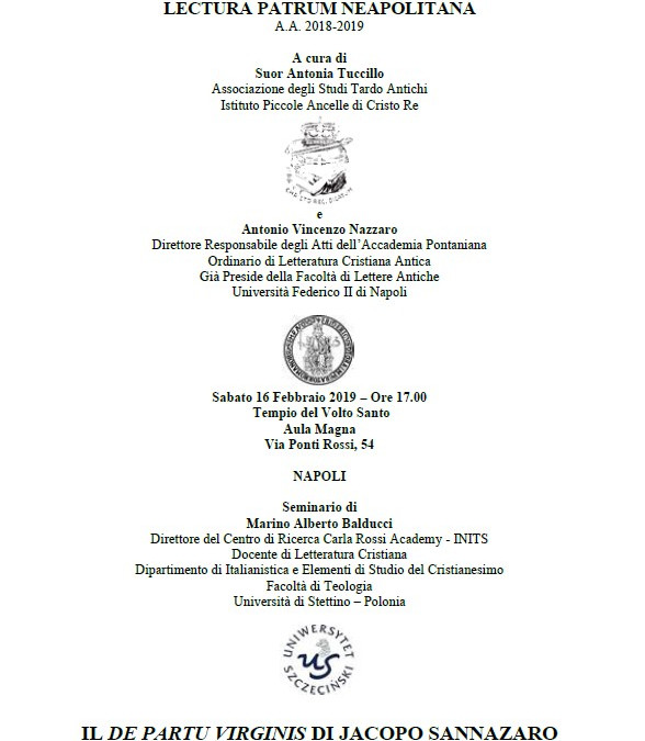 Sabato 16 febbraio 2019, ore 17 Marino A. BALDUCCI Prof. agg. di Letteratura cristiana nella Fac. Teologica Dip. di Italianistica dell’Università di Stettino (Polonia) leggerà Jacopo Sannazaro, Il parto della Vergine a cura di S. PRANDI, F. URSINI (Corona Patrum Erasmiana – Ser. Humanistica) Torino, Loescher,...